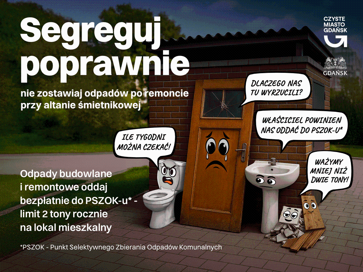 Wyrzucanie odpadów budowlanych do pojemników na odpady komunalne lub pozostawianie ich przy altanach śmietnikowych to poważny błąd. Takie odpady nie są odbierane w ramach gdańskiego systemu gospodarowania odpadami komunalnymi. Konieczne jest ich oddanie do odpowiednich punktów lub zamówienie specjalnych usług. Dzięki temu ograniczamy powstawanie nielegalnych wysypisk, a część materiałów może zostać ponownie wykorzystana.