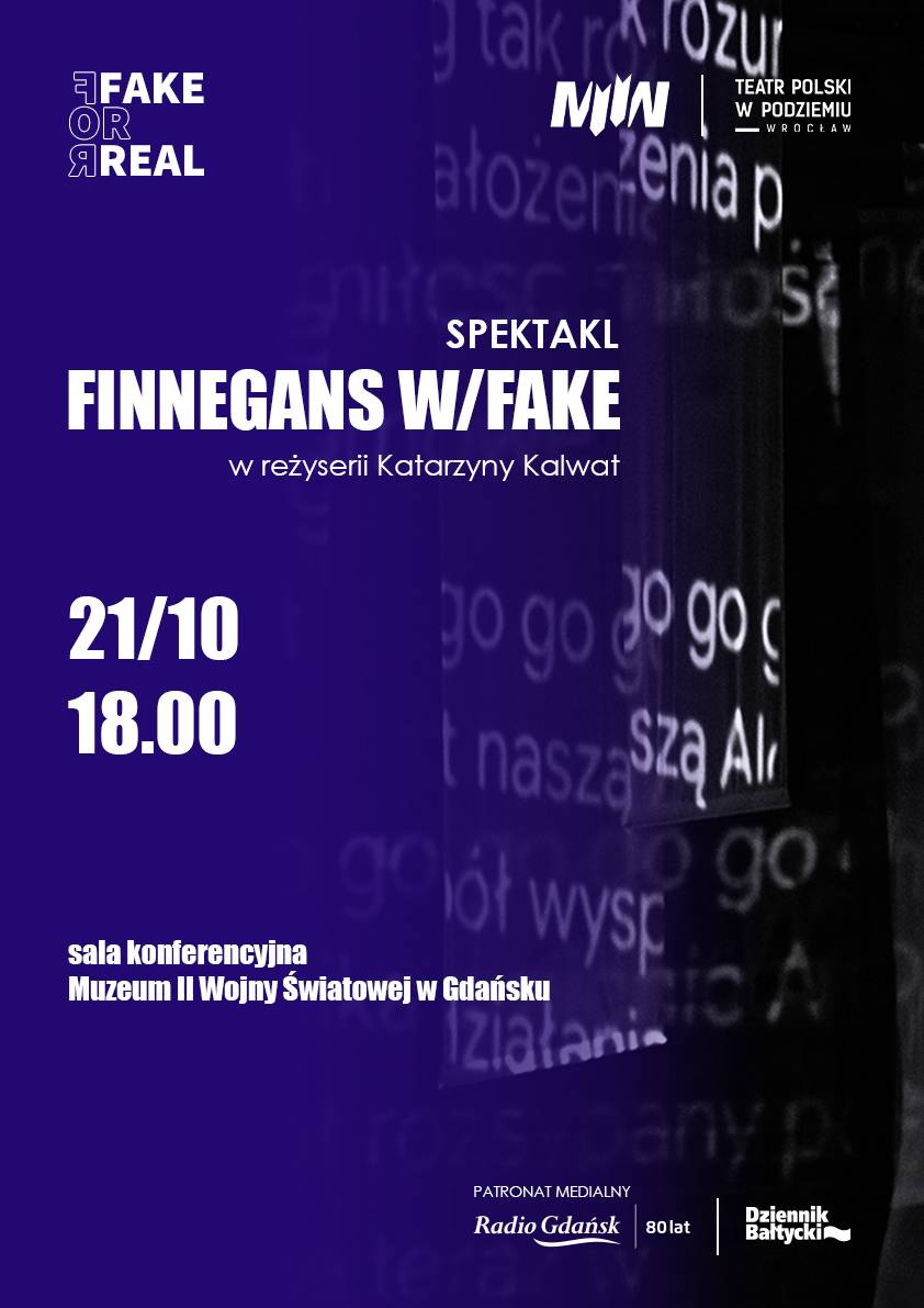 We wtorek (21 października) o godz. 18.00 serdecznie zapraszamy na niezwykły spektakl „Finnegans W/Fake”, inspirowany powieścią Jamesa Joyce’a! Wydarzenie nawiązuje do prezentowanej aktualnie w MIIWŚ wystawy czasowej „Fake for Real: historia fałszerstw i falsyfikatów”.