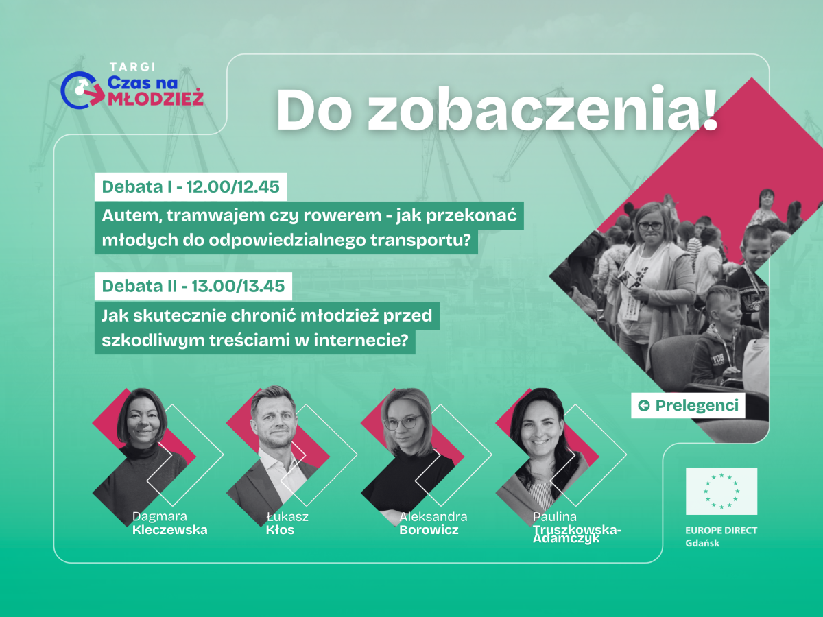 Druga debata, zaplanowana na godzinę 13:00–13:45, nosi tytuł „Jak skutecznie chronić młodzież przed szkodliwymi treściami w internecie?”. Jej prelegentkami będą Aleksandra Borowicz oraz Paulina Truszkowska-Adamczyk, które przedstawią aktualne wyzwania związane z hejtem, agresją słowną oraz toksycznymi zachowaniami w przestrzeni cyfrowej. Omówią znaczenie edukacji cyfrowej, współpracy szkoły i rodziców, a także wsparcia psychologicznego niezbędnego do ochrony młodych użytkowników internetu. W trakcie debaty poruszony zostanie również problem fake newsów, dezinformacji i manipulacji, a także ich wpływ na proces uczenia się oraz rozwój kompetencji krytycznego myślenia. Obie debaty stanowią integralną część programu Targów Czas na Młodzież i mają na celu włączenie młodych osób w dyskusję o tym, jak tworzyć bezpieczną, nowoczesną i przyjazną przestrzeń do życia. Organizatorem wydarzenia jest Europe Direct Gdańsk.