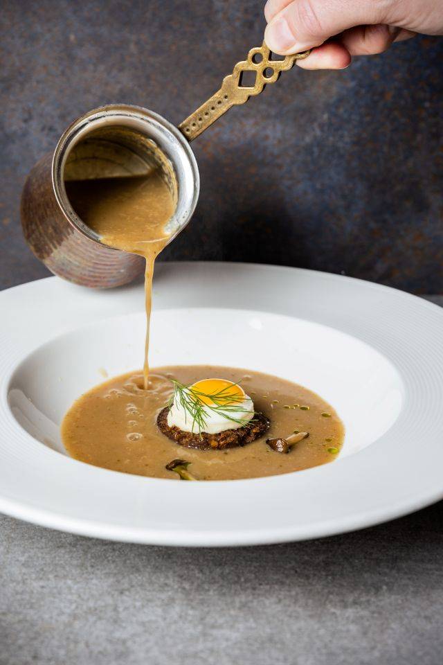 - Roślinny żurek na domowym zakwasie: jajko przepiórcze, grzybowa kaszanka, chrzanowe puree
