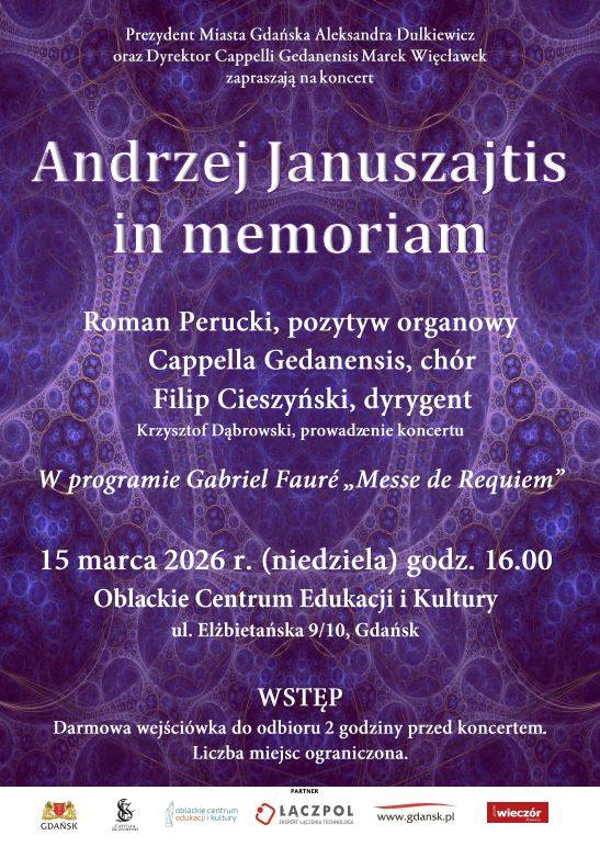 15 marca o godz. 16:00 zapraszamy do Oblackiego Centrum Edukacji i Kultury na koncert poświęcony pamięci prof. Andrzeja Januszajtisa, współzałożyciela i spiritus movens powstania instytucji kultury Cappella Gedanensis.
