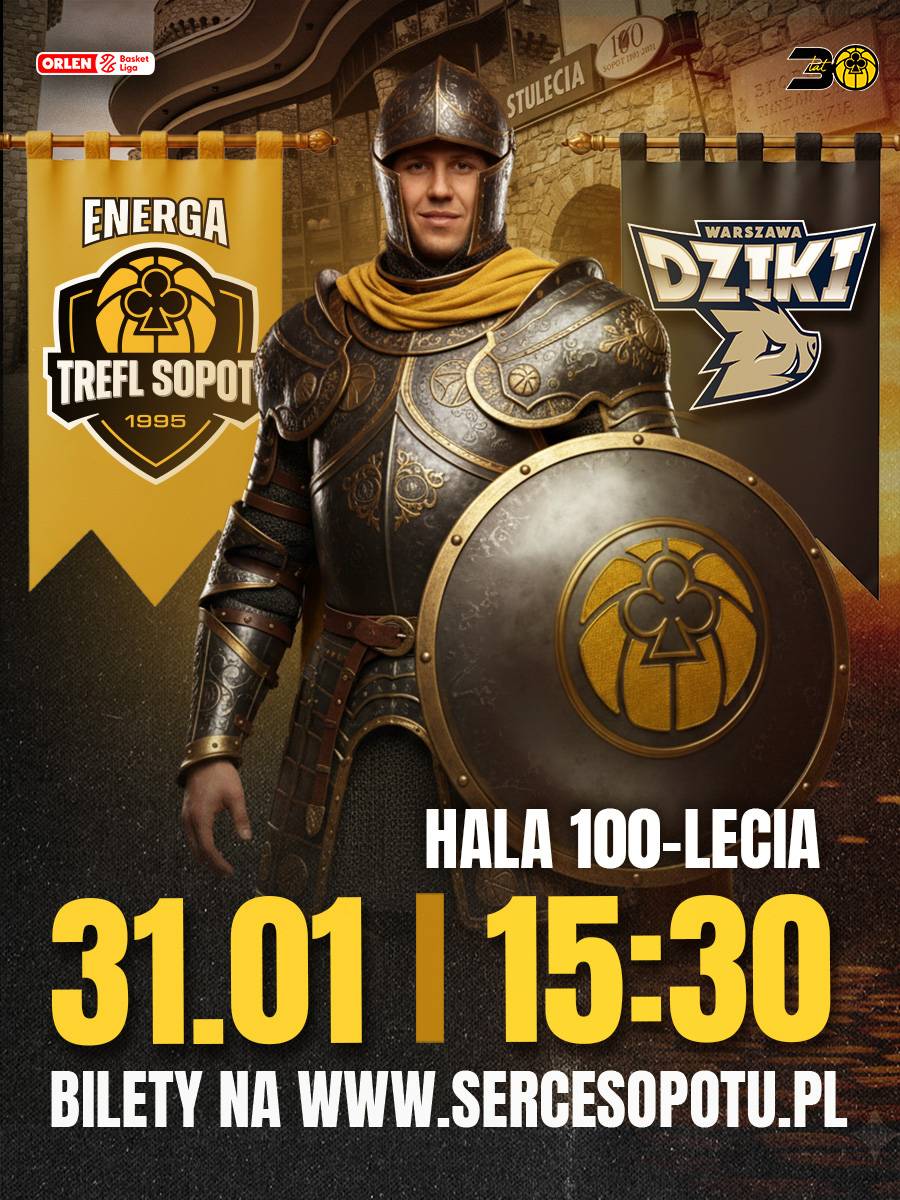 Obronić twierdzę! W ostatnim meczu w styczniu koszykarze Energi Trefla Sopot podejmą na własnym parkiecie Dziki Warszawa. W pierwszym spotkaniu obu drużyn rozgrywanym w stolicy górą byli żółto-czarni, którzy triumfowali 86:80. Teraz czas na rywalizację w Hali 100-lecia, gdzie sopocianie wygrali dotychczas wszystkie mecze w sezonie 2025/2026. Pomóżmy im sięgnąć po kolejne zwycięstwo – widzimy się w Hali 100-lecia w sobotę 31 stycznia o 15:30!