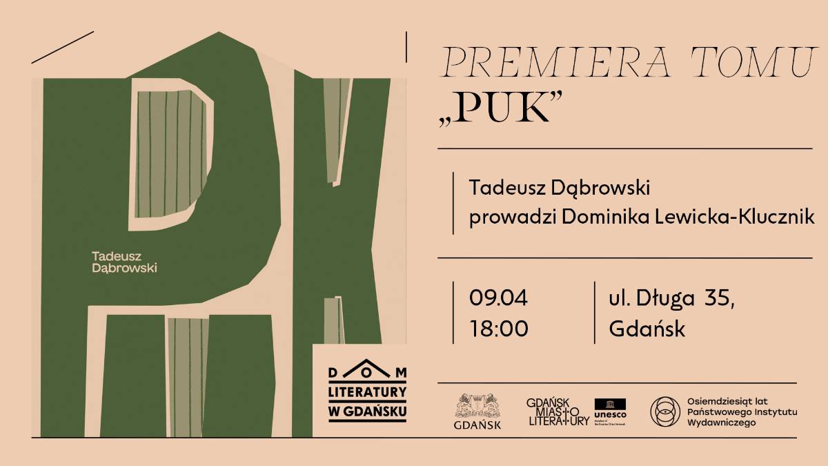 Zapraszamy na spotkanie wokół nowego tomu gdańskiego poety Tadeusza Dąbrowskiego pt. “PUK”. Spotkanie poprowadzi Dominika Lewicka-Klucznik.